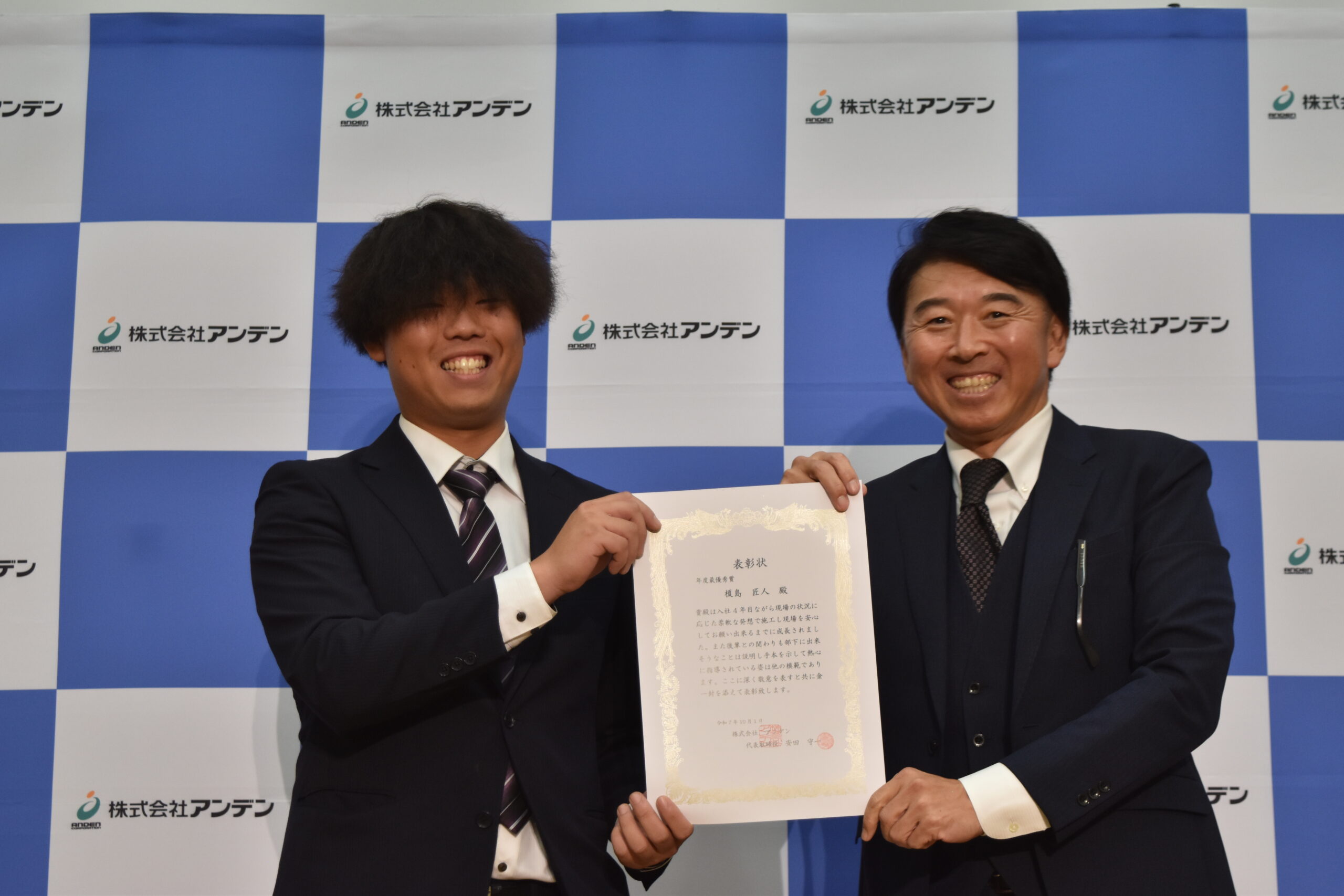 今年の最優秀賞には入社4年目の榎島君が受賞されました。言われた事をやるだけでなく、自ら率先して段取りし、後輩にも熱心に指導する姿はとても頼もしく感じました。